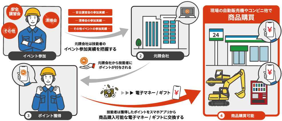 元請会社の裁量で独自のポイントプログラムを簡便に構築できるサービスです。 ポイントは技能者への入場記録、安全講習会・清掃会への参加や、改善提案、意欲的な活動に対して付与することができ、技能者にとっての「報われ感」を実現します。また、元請が技能者に経済的な価値をもつポイントを付与することで、担い手確保や現場の魅力向上施策の一環としてご利用いただけます。