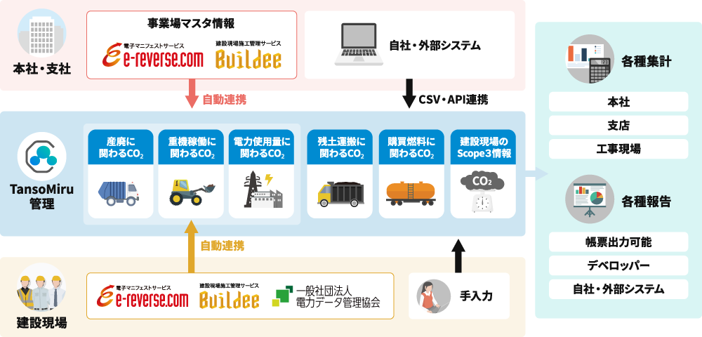 「TansoMiru」(タンソミル)は、『TansoMiru管理』、『TansoMiru産廃』、『TansoMiru電力』、『TansoMiru燃料』、からなるサービスです。一般社団法人電力データ管理協会を通じて取得した電力データや、「e-reverse.com」のデータと連携することで、電力使用時や産廃収運・処理や、揚重機・機材予定からCO₂排出量を自動計算できます。これにより各現場におけるCO₂排出量の把握を効率的に行うことができ、従来の業務負担を大幅に軽減します。