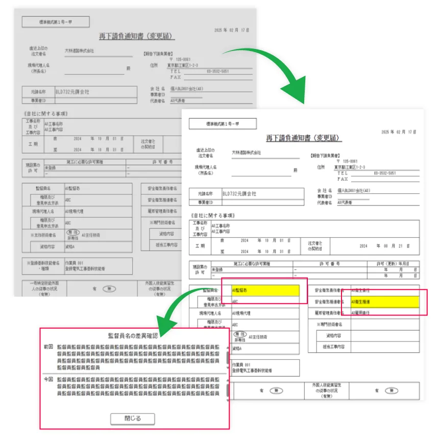 当機能は、協力会社より再提出された労務安全書類のうち、再下請負通知書と作業員名簿の変更箇所がハイライト表示されることで、元請会社は変更箇所を一目で確認できます。またハイライト表示箇所を押下することで、変更前後の記載内容が表示されるため、前回記載されていた内容を手間なく確認することも可能です。加えて、再下請負通知書に添付された関連書類が更新された場合も、添付書類欄がハイライト表示されるため、更新されたことが一目でわかります。